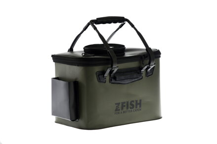 ZFISH Skládací Rybářský Kbelík/Řízkovnice 18L je velice praktická EVA taška určená především na přechovávání živých nástražních rybek, která Vám po složení ve vozidle nezabere tolik místa jako klasická pevná řízkovnice. Celá její její vrchní část " víko" se otevírá po celém svém obvodu díky kvalitnímu zipu. Samotné víko je opatřeno praktickým otvorem ze síťoviny, takže máte nejen perfektní přehled, co se uvnitř nachází a co se s nástražkami děje, ale otvor se také uzavírá jednoduše zipem po celém jeho obvodu a slouží pro snadné vkládání a vyjímání obsahu. Ve víku je umístěn i druhý praktický otvor, který slouží jako průchod pro hadičku vzduchování, které lze k této šikovné tašce samostatně dokoupit a bez problémů spolu využívat, pro uložení přídavného vzduchování je taška na boku opatřena vnější kapsou, do které se běžná vzduchování pohodlně vejdou. Taška je samozřejmě vybavena dvěma plastovými úchopy, které je navíc k sobě možné zafixovat zasunutím jejich vrchních částí do sebe, což velice usnadňuje manipulaci a samotný transport. Tuto novou tašku tedy ocení všichni, kteří potřebují své nástražní rybky přechovat během transportu k vodě, ale dokonale poslouží jako větší vědro nebo kbelík všem ostatním rybářům.